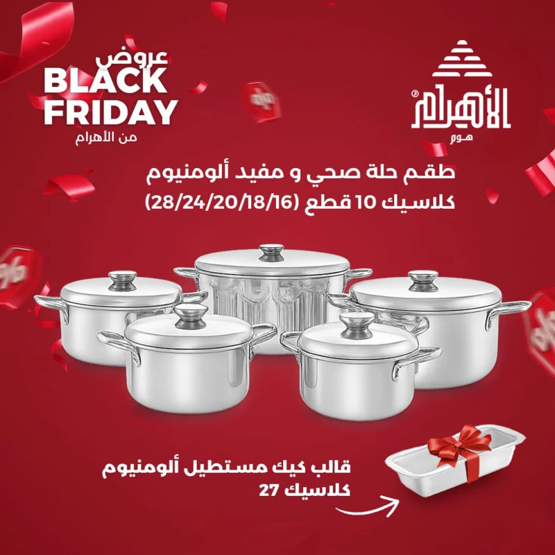 موديل الحلة صحي و مفيد هو أول طقم حلة ألومنيوم في مصر تقدمه الأهرام منذ عام 1965 ، الطقم عبارة عن 5 حلل و 5 غطيان مقاسات 16 / 18 / 20 / 24 / 28 ، التصميم الكلاسيكي للحلة مع بريق الألومنيوم يمنح مطبخك سحر و يساعدك في تقديم أشهي الأكلات المصرية لأسرتك. غطاء الحلة من الألومنيوم محكم الغلق يمنع تسرب البخار مما يوفر وقت الطهي. الطقم مصنوع من خام الألومنيوم النقي عالي الجودة. مع أيادي من الإستانلس مثبتة في جسم الحلة بعدد 4 برشام مما يضمن لك تثبيت محكم في جسم الحلة تحت أقصي ظروف الإستخدام. لا ينصح بوضعه في غسالة الأطباق. + قالب كيك مستطيل هدية مقاس27