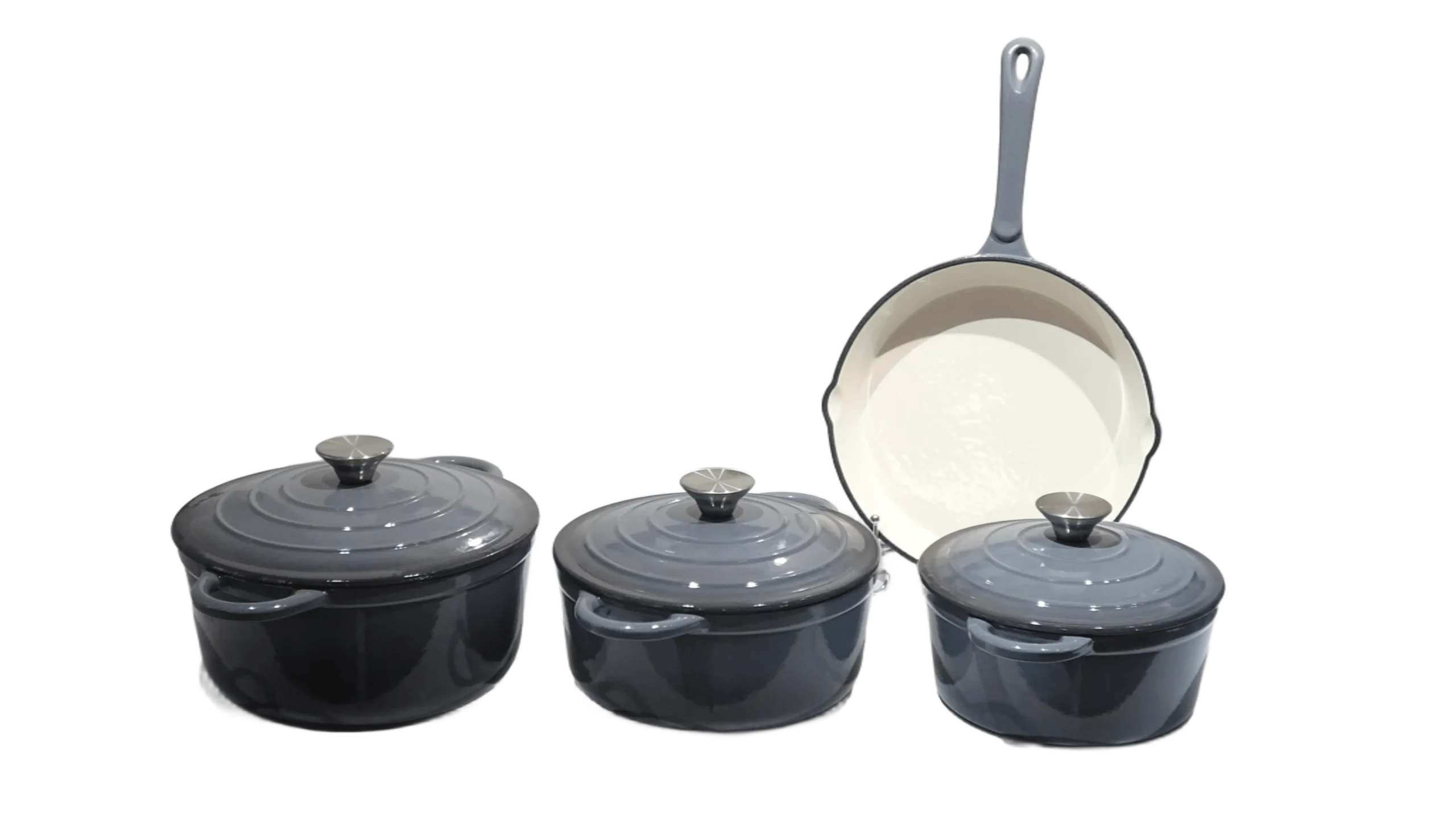 طقم 7 قطع مصنع من الكاست ايرون ليتحمل الإستخدام الشاق و يرضي إحساس عشاق الفخامة الراغبين في الحصول علي تسوية مثالية لقطعة الإستيك لأن الكاست ايرون هي الخامة المثالية التي تضمن لك تسوية و لا أروع لأي قطعة لحم أو استيك – مكونات الطقم : حلة 20 ، 22 ، 24) + مقلاية 24 ، الطقم متاح منه اللون الأسود و اللوه الجراي