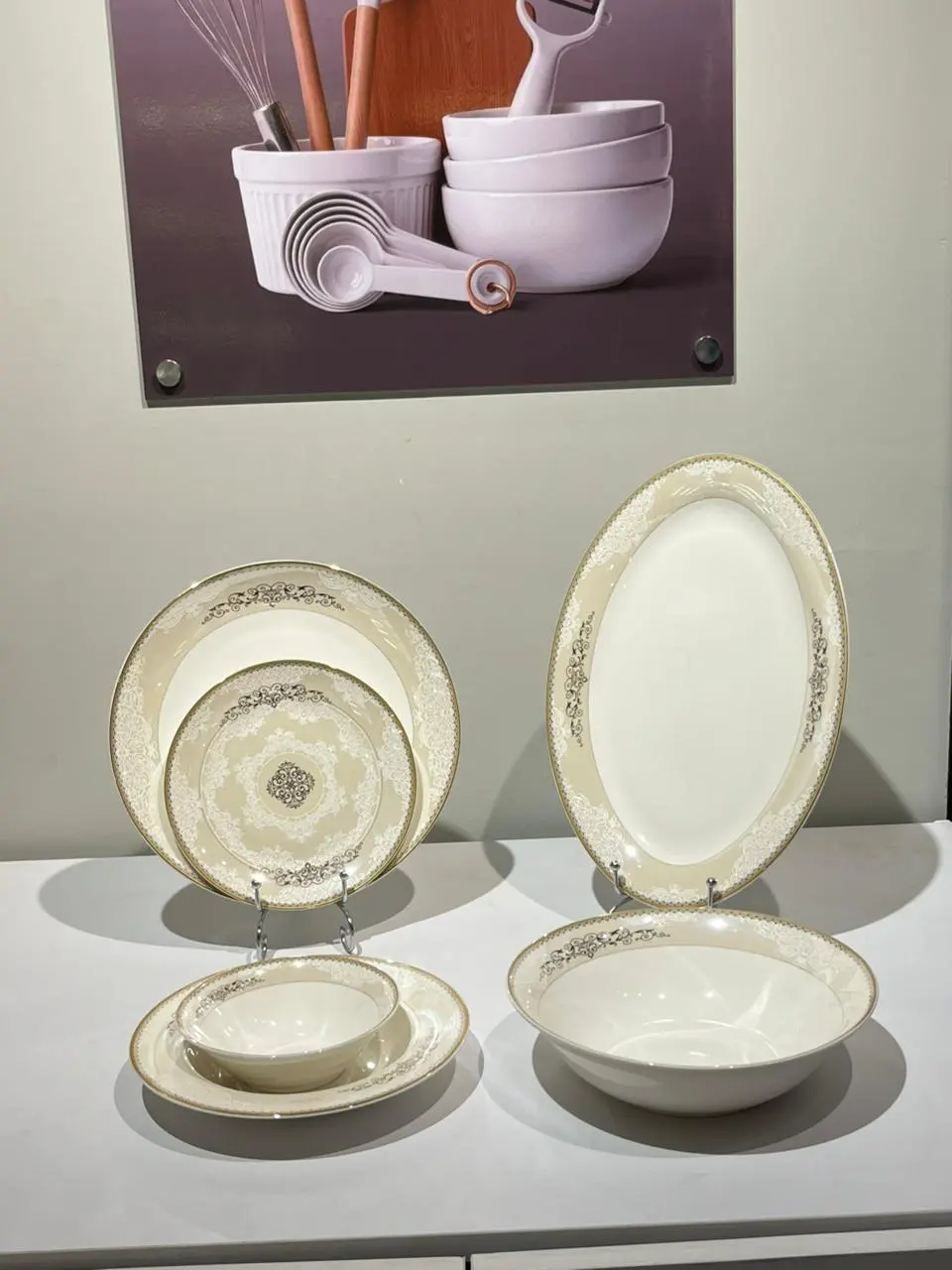 طقم عشا من البورسلين بون شاينا مجموعة كاملة مكونة من 26 قطعة تتضمن خدمة لـ 6 أشخاص مع أطباق عشاء مسطح كبير وأطباق للحلو وأطباق غويطة مستوحي من العصر الباروني لمدينة فيينا. كما يأتي الطقم بلون كريمي مع اللمسة الذهبية في الإطار الخاص بكل قطعة . و هذا يمنح سفرتك فخامة القصور الملكية في العصر الباروني. كما يأتي مع الطقم سرفيس كبير مع بولة كبيرة للسلطة.