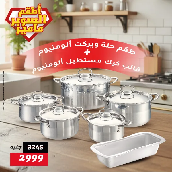 اليد في الحلة الواير كات من الستانلس ستيل لضمان عمر اطول و الغطا كمان من الستانلس ستيل و محكم الغلق لسهولة نظافته علشان يحافظ على بريقه و جماله اطول وقت ممكن” + “القالب الأكثر شهرة مقاس 32 و يعتبر الملك المتوج في عالم قوالب الكيك لتحضير الإنجليش كيك، يتميز القالب من الأهرام و المصنوع من الألومنيوم النقي أن حجمه هو المثالي يمنحك الحجم المثالي للكيك لأن الحجم الداخلي للقالب معتمد من أكبر مصنعي الحلويات في مصر من حيث الحجم الأنسب للإنجليش كيك. توزيع مثالي للحرارة ، يضمن لك نتيجة مثالية كل مرة.